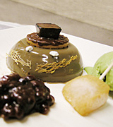 ほうじ茶プリン「茶色のプリンでチャップリン」380円。