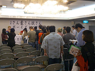 展示会は右側の階段を上ったお二階の二部屋を占領してて、ボリュームたっぷり。初日とはいえ平日だし・・・と思ってたのですが、次から次へと入場者がやってきて大盛況。あちこちで昔話に花が咲いてる様子。 お部屋とお部屋の間にあるロビーには、新聞の切り抜きなど閲覧可能になっていて、三々五々のお楽しみ風景がみられました。