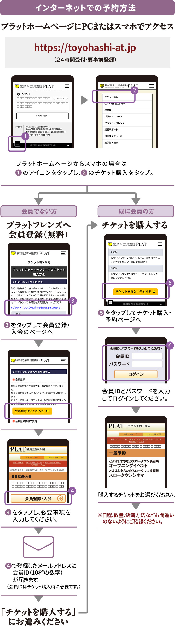 その他のイベントやスロータウンシネマは、オンライン予約にて日時ごとに4枚まで購入できます。5枚以上ご購入の場合、オンライン予約ではカート機能をご利用いただくか、再びログインして複数購入できます。プラットチケットセンターの電話(0532-39-3090)でも5枚以上の予約が可能です。